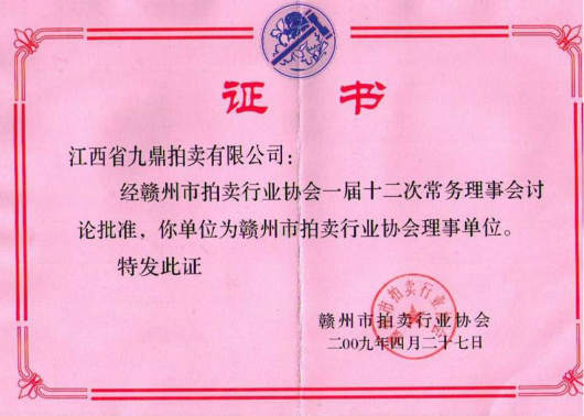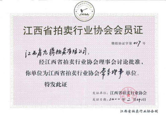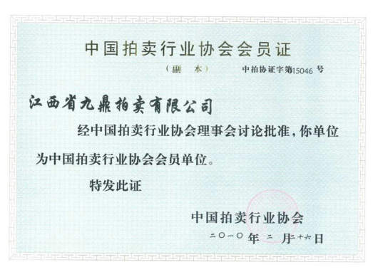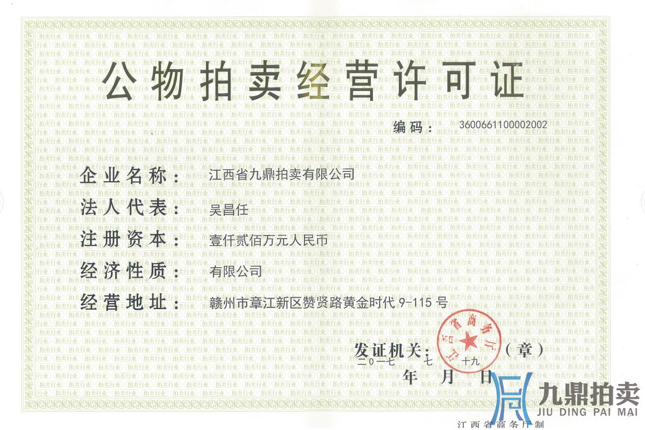 江西省九鼎拍賣有限公司是嚴(yán)格按照《中華人民共和國(guó)公司法》、《中華人民共和國(guó)拍賣法》等有關(guān)法律法規(guī)而成立的拍賣機(jī)構(gòu),是國(guó)家A級(jí)資質(zhì)拍賣企業(yè)、中國(guó)拍賣行業(yè)協(xié)會(huì)會(huì)員單位、江西省公物拍賣指定單位、江西省拍賣行業(yè)協(xié)會(huì)常務(wù)理事單位,是目前江西省規(guī)模較大、起點(diǎn)較高的專業(yè)拍賣單位。公司遵照《中華人民共和國(guó)合同法》、《中華人民共和國(guó)拍賣法》等法律法規(guī)、政策,依法接受公民、法人或其他組織的委托,并提供財(cái)產(chǎn)鑒定評(píng)估、過(guò)戶代理等業(yè)務(wù)。